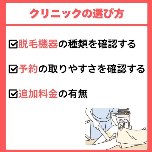 脱毛は複数回の通院が必要なため、通いやすさと予約の取りやすさも選定のカギになります。予約の取りやすさは口コミなどで確認しておきましょう。また、自宅や職場からのアクセスが良いか、予約がネットで簡単に取れるか、当日のキャンセル対応をしてくれるかなども確認しておきましょう。