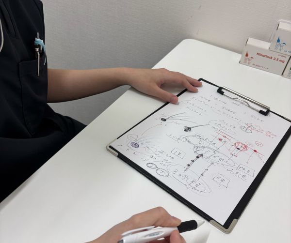 カウンセリングは一人ひとり、たっぷりと時間をかけて行ってくれます。薄毛のメカニズム、発毛までのプロセスなど丁寧に紙に書きながらわかりやすく説明をしてくれます。