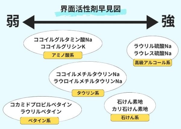 アミノ酸系やベタイン系の界面活性剤は低刺激で肌への悪影響が少なく、また石けん系の界面活性剤はさっぱりした洗い上がりでありながらも、低刺激で肌への負担が少ないのが特徴です。